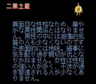 89电脑占星术(’89 Dennou Kyuusei Uranai)是红白机时代一款充满复古魅力的电子占卜游戏。只需输入姓名和生日,就能获得运势、健康、爱情等趣味预测,带你重温80年代的数字占星体验。