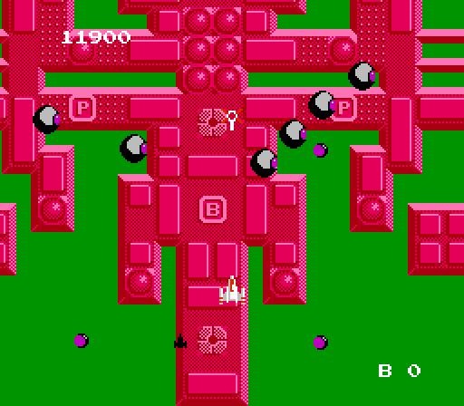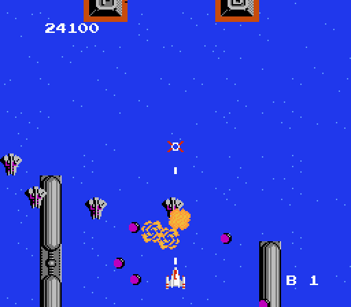 游戏画面向上滚动,一波又一波的敌人会试图阻挡你的前进,向你的飞船发射速度快慢不一的子弹。你可以使用空对空和空对地导弹一路杀敌,同时寻找奖励。游戏中会出现一些绘制粗糙的建筑物,你需要射击或避开它们,因为撞上去可能会撞到。在前进的过程中,你的飞船可以根据需要向左或向右移动任意距离。最后,在每个关卡的最后,你都需要摧毁一个大型敌人。