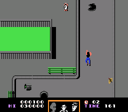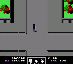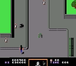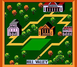 LJN 的游戏与电脑版截然不同,它以一场与时间赛跑的冒险为核心,穿插着一些简短的街机小游戏。在主游戏中,玩家以俯视视角操控马蒂,在20世纪50年代的希尔谷街头奔跑。各种符合时代背景的“坏蛋”会阻挡他的去路,包括恶霸、呼啦圈女孩、大黄蜂和公园长椅。镜头以固定速度向前滚动,因此玩家必须让马蒂保持移动并避开障碍物。撞到障碍物会导致马蒂摔倒并失去一条命。玩家还必须收集散落在街头的时钟,以防止马蒂的照片逐渐消失。如果它完全消失,马蒂就会从世上彻底消失。