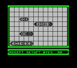 NES 和 Game Gear 平台的《战舰》是一款改编自纸笔战舰游戏的全新作品,并在此基础上进行了创新。游戏中的舰船种类和尺寸都与原作有所不同,网格尺寸也由标准的 10x10 改为 12x8,且每回合只能发射一次炮弹,无论命中与否。与经典游戏相比,本作的主要变化在于关卡结构和特殊武器。游戏包含八个主关卡,每个关卡又分为五个子关卡,玩家在成功完成战斗后可以获得密码。每个主关卡都会新增一个游戏元素:要么是新增一艘舰船(潜艇和航母初始不可用),要么是为现有舰船添加一种新武器。特殊武器可以向网格上的多个点发射大量导弹,例如呈 X 形排列。舰船越大,发射的导弹覆盖范围也越大。每艘舰船每局游戏只能发射一次特殊导弹,如果搭载该武器的舰船被摧毁,则该武器将无法使用。后续关卡还会加入侦察武器:一种只能探测潜艇的声呐和一种可以侦察任何舰船的空中侦察机。