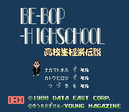 游戏改编自 1983 年开始出版的漫画系列《Be-Bop High School》。故事围绕着两个坎坷的高中朋友加藤浩和仲间彻的生活展开,他们经常制造麻烦并开始打架。为了与漫画的精神保持一致,Toru 和 Hiroshi 将头发梳成光滑的蓬巴杜,并采用夸张的招摇步态。漫画还展示了各种古怪的角色,他们也拥有不寻常的时尚和发型。这款视频游戏是一款文字丰富的冒险游戏,玩家控制一群高中男生。