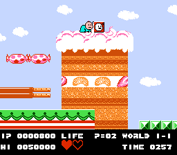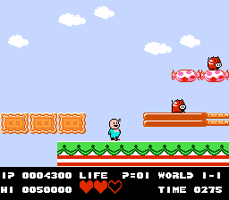 游戏使用生命值计量表来监测玩家的剩余生命值,可以通过收集散落在关卡各处的牛奶瓶来补充。此外,玩家还可以获得一个心形图标,在当前世界持续时间内增加一个单位的最大生命值。大多数物品,包括牛奶瓶和心形,都可以通过击打印有 Upa 头像的特殊方块来收集。其他物品包括:苹果(可增加玩家得分);沙漏(可暂时冻结敌人);铃铛(可使 Upa 暂时无敌并获得奔跑能力);以及蝎子方块(将其从平台上推落至地面时可杀死屏幕上的所有敌人)。