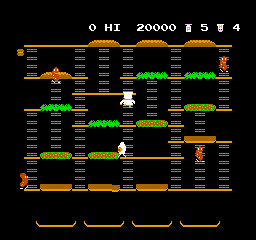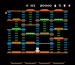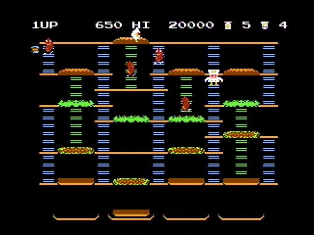 要成功制作汉堡,你必须将所有食材组合在一起,从高处扔到下方的汉堡制作区域。具体操作是,你需要让佩珀厨师踩过每一种汉堡食材。一旦踩到食材(例如一片生菜),它就会掉落到下一层。掉落的食物会压扁追赶你的敌人,还会将下方的其他食材“撞”得更低。此外,作为抵御敌人的紧急防御手段,你可以收集胡椒瓶,喷出一小团胡椒粉,短暂地眩晕敌人,让你得以从他们身边走过。