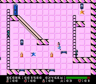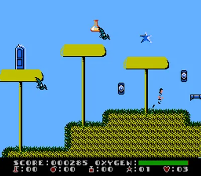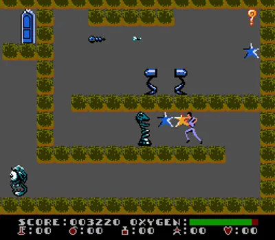 你是无畏的太空探险家达什·加拉西。你刚刚降落在一个距离地球数千光年的陌生外星星球上。你的任务是穿过迷宫般的房间,安全返回飞船。为此,你需要进入每个房间,收集所有物品。不过,你的氧气有限,所以一定要抓紧时间!在这个星球上,到处都是外星生物,与它们接触会加速氧气的消耗。偶尔你会找到炸弹或钥匙,可以用来进入之前无法到达的房间。游戏采用两种视角:在电梯井中时是俯视视角,在各个房间中时是横版卷轴视角。有些关卡包含隐藏房间,里面有许多奖励,甚至还有直达电梯,可以让你更快到达目的地(当然,它也可能把你送回下几层)。
