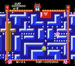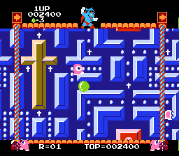 《恶魔世界(Devil World/デビルワールド)》是一款卷轴迷宫游戏,与经典的吃豆人游戏极为相似,只是增添了浓厚的宗教色彩。玩家需要在由魔鬼亲自操控的自动卷轴迷宫中收集圆点,利用十字架强化自身并消灭魔鬼的爪牙,同时还要小心别被墙壁压扁。收集完所有圆点后,玩家必须收集圣经来封印敌人的源头,迫使魔鬼暂时撤退。之后,游戏会进入一个限时奖励关卡,玩家可以控制卷轴的滚动,然后下一轮游戏会从头开始循环。
