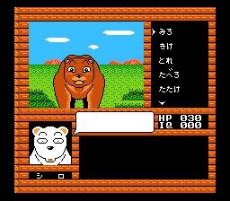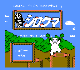 《白熊历险记(Katte ni Shirokuma: Mori o Sukue no Maki!/かってにシロクマ もりをすくえのまき)》是一款指令驱动的冒险游戏,由 Graphic Research 为 Famicom 开发,并于 1989 年由 CBS/索尼集团在日本独家发行。它改编自一部关于一群森林动物的漫画和动画,其中的主角是一只经常被误认为是北极熊的白化日本黑熊。对于这个时代的冒险游戏来说,这很不寻常。角色也有自己的生命值和“智商”属性数据,这在游戏中发挥着巨大的作用。