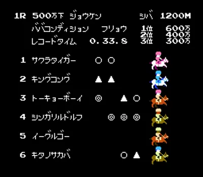 《家庭竞马》(Family Jockey)是一款经典红白机赛马游戏,支持单人或双人同乐。游戏开始时玩家可从各具特色的赛马中选择心仪战驹,每匹马都拥有独特的属性特点。在激烈竞速中,挥鞭加速会消耗耐力,需要策略性使用。多样化的赛道地形将带来不同挑战,每场赛事必须跻身前四才能晋级。双人模式特别加入了趣味十足的赌马玩法(该功能在GB移植版中被取消),让对战更添刺激。这款游戏完美融合了策略与竞技乐趣,是FC时代不可多得的赛马模拟佳作。