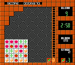 游戏共有60个阶段。使用方向键(仅向上或向下)和按钮击中与玩家持有的方块具有相同标记的方块,以便从堆中擦除方块。