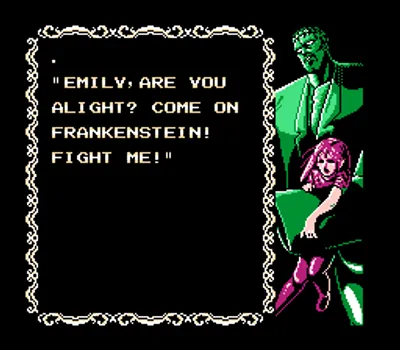 《弗兰肯斯坦》是一款横版卷轴冒险游戏,玩家将对抗各种噩梦般的怪物。有些人甚至认为它是NES上广为人知的《恶魔城》系列的克隆作品。游戏开始时,你只有拳头……但可以从敌人身上获得一根魔法棒。找到额外的强化道具可以让这根魔法棒拥有发射火球的能力。游戏中各个房间里都藏有宝箱,还有一些角色可以通过对话提示帮助你完成任务。