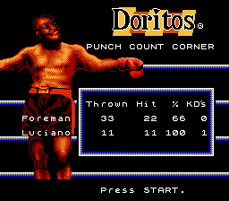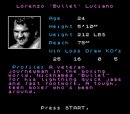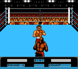 通过躲避和反击,玩家通常可以释放超级重拳,造成更高的伤害。比赛最多进行三个回合,每个回合三分钟。当拳击手被击倒四次时,比赛结束(技术性击倒)。同样,当拳击手在一个回合内被击倒三次时,比赛结束(常规击倒)。被击倒后,玩家需要快速连续按下两个出拳键才能重新站起来。屏幕上会显示能量条,能量条会在受到攻击时减少。角色被击倒后以及比赛间歇期间,会恢复部分能量。