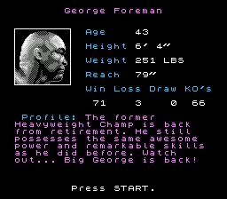 这款拳击模拟游戏以重量级拳王乔治·福尔曼为主角,玩家将扮演福尔曼,与不同的拳击手进行十二回合的比赛,最终赢得冠军腰带。