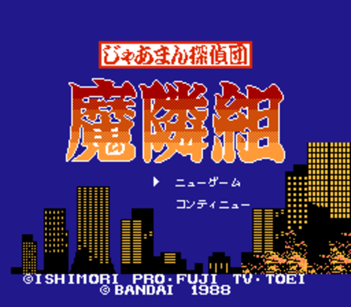 《侦探团魔邻组(German Tanteidan MarinGumi - Maruhi Jigomar Sousa File/じゃあまん探偵団 魔隣組)》是一款万代开发并发行于任天堂 FC 磁碟机的动作冒险游戏。