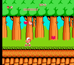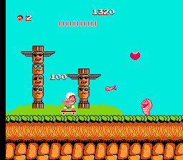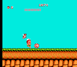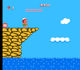 这是一款横版卷轴游戏,希金斯大师从屏幕左向右移动,并在巨大的蛋中寻找强化道具。其中就包括滑板,它可以大幅提升速度——但一旦被击中就会失去速度。如果他没有踩着滑板,一旦被击中就会立即死亡。游戏的另一个机制是饥饿值,它会通过一个不断减少的计量条来显示。如果计量条归零,英雄就会死亡,而补充计量条的唯一方法就是沿途收集食物。每个关卡的最后都有强大的Boss等待着他,最终他会与邪恶的巫医决一死战。