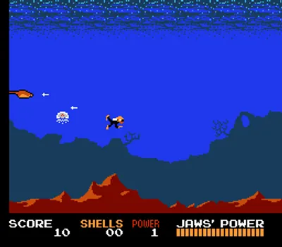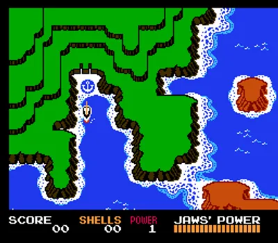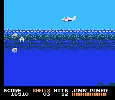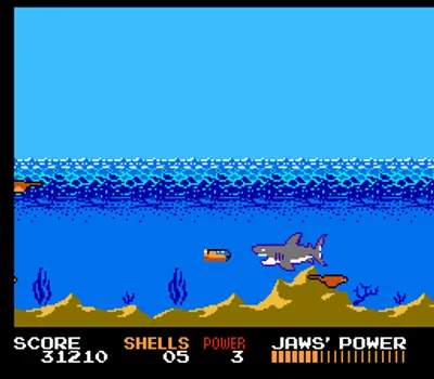 《大白鲨(Jaws)》大致改编自第四部电影《大白鲨4:复仇》,玩家将操控一艘船在海洋上航行,寻找杀人鲨鱼。途中,船会停下来让潜水员下水,猎杀幼鲨、水母和蝠鲼来收集海螺壳。海螺壳可以用来升级船只。在奖励关卡中,玩家可以额外获得海螺壳,届时会有水上飞机飞过水面轰炸水母(类似于视角反转的《Galaga》奖励关卡)。