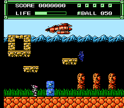 在平台关卡中,被击败的敌人会掉落生命(“L”块)或金钱(“E”块)能量提升。收集 E 块是为了用它们交换能量提升和信息,以及访问迷你游戏。这些都通过门或隐藏的门分散在整个平台关卡中。在射击关卡中,玩家可以找到 “S ”和 “P ”道具,分别升级速度和武器。