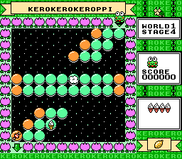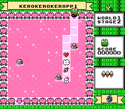 游戏中 Keroppi 必须营救被锁在城堡里的女友 Keroleen。为此,他必须在七个不同主题的世界中解决基于动作的谜题,这些世界中有四种不同类型的关卡(迷宫表面、驾驶飞机、类似黑白棋的关卡和穿越熔岩场)。游戏中的所有物品都是预先确定的。需要记住每次游戏的模式,以便玩家在获得一定程度的游戏专业知识后可以更快地通过关卡。