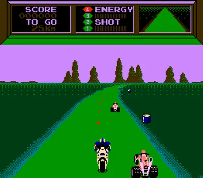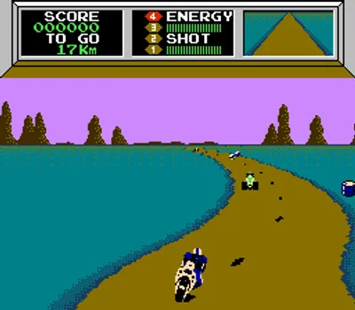 《超音速机车赛(Mach Rider/マッハライダー)》是一款设定在后末日未来的摩托车战斗游戏。玩家扮演 Mach Rider,必须穿越十个区域,在敌人占领城市之前抵达目的地。敌方的激进车手会试图将玩家逼出赛道;道路上的障碍物,例如岩石和众多弯道,也可能导致玩家偏离路线。如果 Mach Rider 被摧毁,它会重新组装,以便继续前进。