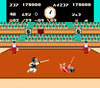 《六三四之剑》红白机游戏(日文名:Musashi no Ken Tadaima Shugyou Chuu)忠实还原经典漫画与动画IP,带来双模式热血体验!在紧张刺激的过关模式中,化身主角夏木六三四,争分夺秒突破重重关卡,沿途收集珍贵剑道标志;而在热血沸腾的对战模式中,巧妙运用收集的必杀招式击败对手,一招一式尽显剑道精髓!注意:招式耗尽将陷入被动,策略性管理招式资源是制胜关键。经典IP与创新玩法的完美结合,带你重温红白机时代的剑道激情!