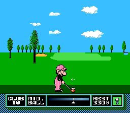 在NES版《公开赛高尔夫(NES Open Tournament Golf)》中,玩家可以在三个不同的球场之一进行一轮高尔夫比赛。游戏支持单人或双人模式,分别在美国、日本或英国进行,并可选择比杆赛或比洞赛模式。游戏采用两种视角:首先是俯视视角,方便玩家设置击球姿势和选择球杆;然后切换到3D视角。击球时使用通用的力量计量表,点击按钮启动计量表,再次点击按钮选择击球力度,第三次点击按钮选择右曲球或左曲球的幅度。如果一次无法完成一轮比赛,《公开赛高尔夫》还配备了电池备份功能,允许玩家保存游戏进度并在之后继续。