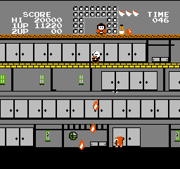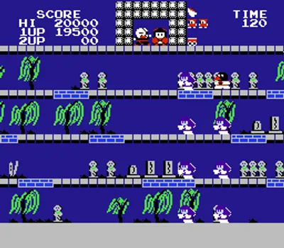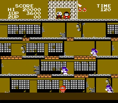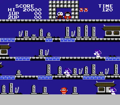 茶茶丸的初始位置是一个三层水平场地的底部。每一层都有两名敌人。场地顶部是脆弱的砖块,茶茶丸可以通过跳跃打破这些砖块。要通关,必须击败所有敌人。大多数敌人可以用手里剑击杀,手里剑是游戏中唯一无需道具即可使用的武器。有些敌人需要通过击晕来击败,例如掉进场地上的洞里或者被跳到身上。手里剑还可以抵消敌人的投掷物。被敌人的投掷物击中,或者在少数情况下被敌人的身体击中,都会立即死亡。敌人被击败后,其灵魂会升腾,你可以拾取灵魂获得额外分数。