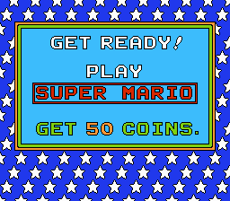第一款游戏是《超级马里奥兄弟》,玩家拥有99条命,目标是在第一关收集50枚金币。收集到第50枚金币后,会播放“城堡通关”的音乐,并显示分数。