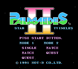 《骰子方块2(Palamedes II - Star Twinkle/パラメデスII)》可以说是“前作的翻版”。和前作一样,你的目标是重新排列一组骰子,并将它们排成一排进行消除。只有像 4-4-4-4-4 或 1-2-3-4-5 这样的骰子序列才能被消除,并且根据序列的不同,这将导致屏幕上一行或多行骰子被消除。与原版《阿拉米德斯 II》不同,这次你的角色站在骰子顶部,除非他做出正确的组合来消除骰子,否则不断增长的骰子堆会将他压垮。这有点像《俄罗斯方块》,也有点像《卡拉克斯》。