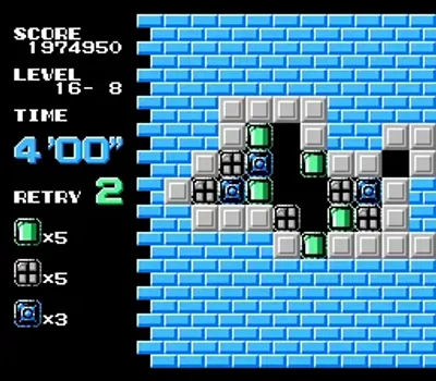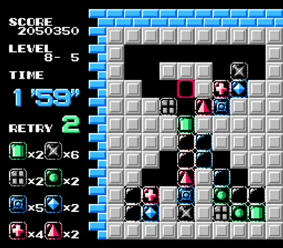 游戏中每一关的挑战都是将选定的方块移动到位,并通过让它们与相同设计的方块接触来清除所有方块。你可以控制十字准线,它可以左右移动方块,如果方块所占空间下方没有方块,则会导致其掉落。