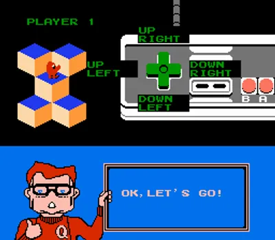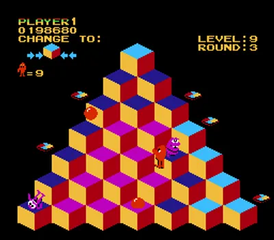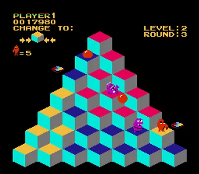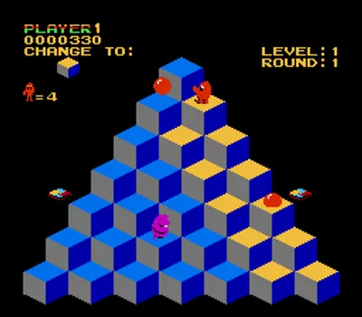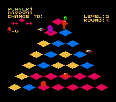 游戏目标是将金字塔上的所有方块变成目标颜色。你需要操控 Q*bert 在金字塔上移动,他每跳到一块方块,方块的颜色就会改变。在早期关卡中,只需跳一下就能将方块变成目标颜色;但在后期关卡中,你可能需要多次跳到同一块方块上,甚至需要避免多次跳到同一块方块上!许多不同的生物会在游戏区域内游荡,试图阻止 Q*bert,其中包括蛇 Coily、Slick 和 Sam,以及不断下落的小球。游戏区域边缘有一些漂浮的圆盘;如果 Q*bert 在蛇追赶时跳到其中一个圆盘上,蛇就会掉下游戏区域,而 Q*bert 则会安全地被传送到金字塔顶端。