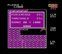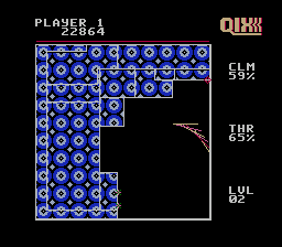 在这个游戏中,你要操控一个标记物,通过绘制矩形和其他奇形怪状的物体来占领你的领地。你可以选择快速或缓慢地绘制矩形,使用“慢速”方式绘制可以获得最高分。矩形绘制完成后,会被涂上颜色,表示你已经占领了领地。绘制矩形时,你需要小心屏幕上爬行的彩色线条——Qix(发音为“kicks”)。除了Qix,你还要避开沿着边界移动的火花(Sparks),以及你绘制的线条,还有沿着你绘制的线条移动的导火索(The Fuse)。占领足够的领地后,你就可以进入下一关了。