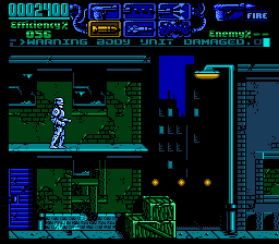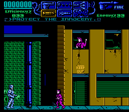 NES 版《机械战警3》是一款平台射击游戏,主角是同名的金属机械战警。该版本在很多方面都与 Probe Software 开发的 8 位电脑版相似:两款游戏共享关卡美学、设计和配乐。然而,NES 版却截然不同:它没有第一人称射击关卡;取而代之的是,第一关是一个独特的横版卷轴关卡。所有关卡的设计都略有不同,所有 Boss 也都经过重新设计,包括坦克 Boss 和最终 Boss 战——在最终 Boss 战中,机械战警需要完成与消灭忍者截然不同的任务。