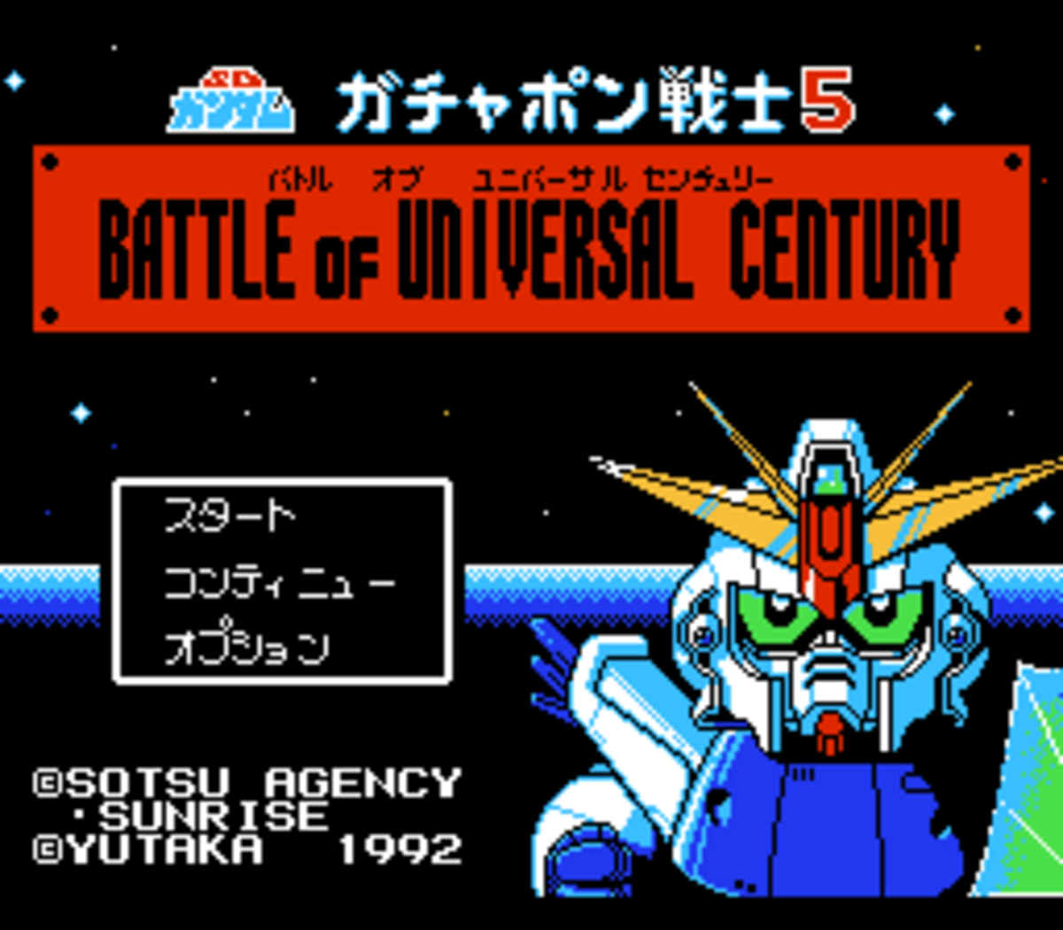 《SD高达扭蛋战士5:宇宙世纪的战斗(SD Gundam - Gachapon Senshi 5 - Battle of Universal Century/SDガンダムワールド ガチャポン戦士5 BATTLE OF UNIVERSAL CENTURY)》是《SD高达世界》系列在红白机上的最后一部作品。游戏的目标是率领你的军队与成群的敌对军队展开战斗,征服地球和宇宙。