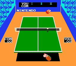 《乒乓球(Smash Ping Pong/スマッシュピンポン)》游戏重现了快节奏的乒乓球运动。每场比赛的获胜条件是先得 10 分,且领先 2 分——如果比分达到 10-9,比赛将继续进行,直到一方领先 2 分或达到 15 分为止,这与网球的规则类似。游戏设有九个难度等级,随着比赛的进行,难度也会逐渐增加。人类玩家拥有先发球的优势,并且每五分轮换发球,因此你至少能保证与对手拥有相同的发球机会(请记住 10 分和 15 分在计分中的重要性)。计分系统鼓励长时间的拉锯战和较大的分差,因为每次击球、每次得分以及每分的胜负分差都会为你赢得分数。