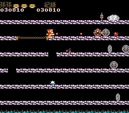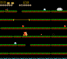 本作是一款横向卷轴游戏,屏幕自动滚动。屏幕上共有6个平台,偶尔会有间隙。玩家控制着一个小猴(从孙悟空原型而来),在平台上跳跃并攻击敌人。