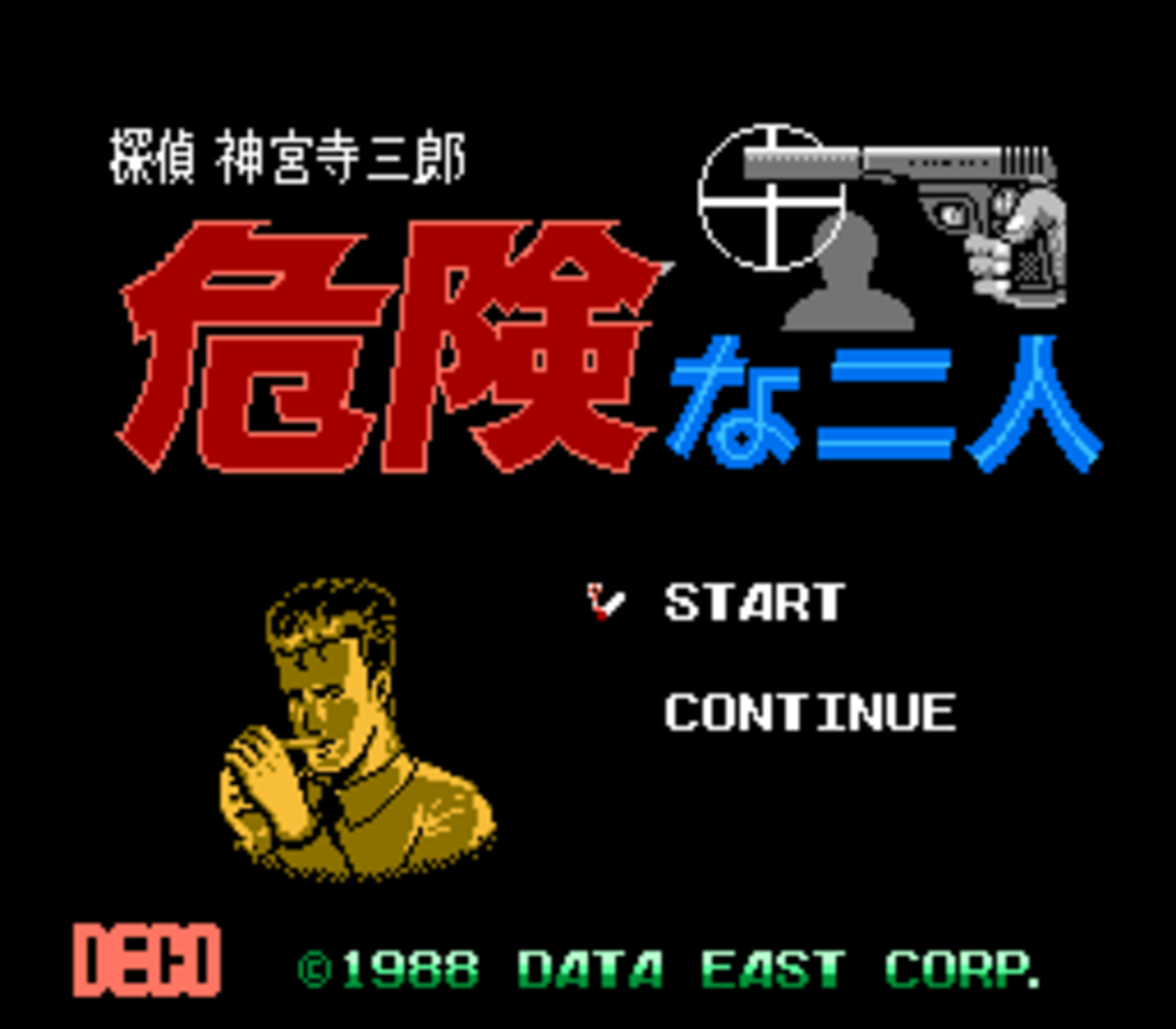 《侦探神宫寺三郎:危险的两人(Tantei Jinguuji Saburou - Kiken na Futari/探偵 神宮寺三郎 危険な二人)》是“侦探神宫寺三郎”系列的第三部作品,回归了 FC 磁碟机平台,并使用两张磁碟卡分两期发售。