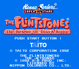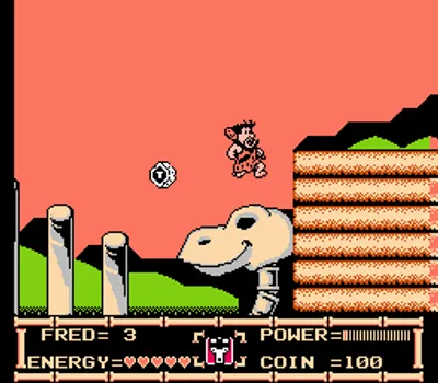《摩登原始人:拯救迪诺和霍比(The Flintstones The Rescue of Dino & Hoppy/フリントストーン)》是一款 NES 平台的横向卷轴游戏,于 1991 年发行,后由太东于 1992 年在日本发行 FC 版本。在游戏中,你将操控弗雷德·摩登原始人穿越基岩、礁岩、丛林等多个地点,寻找加祖时光机丢失的碎片。弗雷德拥有他值得信赖的棍棒,他可以用它攻击,或者按住 B 键来增强能量,发动更致命的攻击。弗雷德击败敌人后可以收集金币,用于购买弹弓和战斧等辅助武器,以及飞行和潜水等特殊能力。