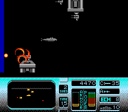 玩家将操控“红色十月”号,体验它逃亡的刺激之旅。游戏采用水下横版卷轴玩法。“红色十月”号潜艇可以向四个方向移动。A键向右水平发射鱼雷,B键向上垂直发射导弹。此外,玩家还可以短时间激活“履带式推进器”(隐形)。玩家还可以激活电子对抗装置,摧毁附近所有攻击性武器。屏幕上始终显示“红色十月”号的装甲(生命值)和动力(燃料)状态;如果其中任何一项数值过低,“红色十月”号都将面临被摧毁的危险。摧毁敌人可以获得增强道具,用于增加或减少导弹和鱼雷的威力。