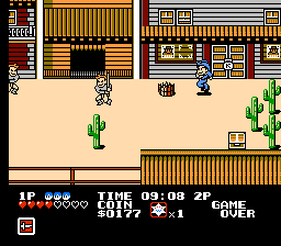 在这个游戏中,你扮演警长萨姆,一个年轻的枪手,游历各地与坏人战斗并玩迷你游戏。主游戏玩法是你在城镇中水平移动,通过击打宝箱收集金币,同时在坏人杀死你之前将其消灭。游戏还包含角色扮演元素,你需要拜访城镇中的居民才能继续前进,就像一开始那样,你需要先获得一把刀,然后砸开箱子获得金钱,购买钥匙才能进入警长办公室。成为警长后,你就可以前往各个城镇追捕不法之徒,赢取赏金。游戏中还有一些迷你游戏,比如射击场,你需要在射击坏人目标的同时,避免射中无辜的旁观者目标。