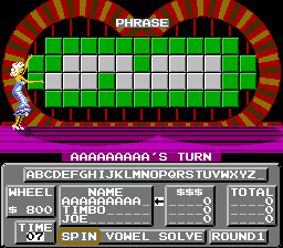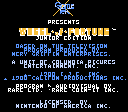 《幸运之轮:少年版(Wheel of Fortune - Junior Edition)》是根据著名电视游戏节目改编的NES系列游戏之一。游戏目标是通过猜字母来解开一个单词谜题。玩家轮流转动一个转盘,转盘上大部分格子都标有相应的金额,但如果转到错误的格子,玩家可能会破产。玩家可以猜一个字母,如果猜中的字母出现在谜题中,则该格子会被翻转以显示该字母,玩家可以获得转盘上显示的金额乘以该字母出现的次数。只能猜英语辅音字母——5个英语元音字母可以用玩家的奖金购买。