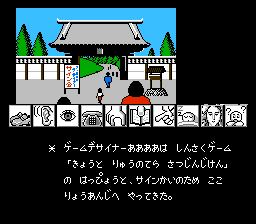 《山村美纱悬疑系列:京都龙之寺杀人事件(Yamamura Misa Suspense Kyouto Hana no Misshitsu Satsujin/山村美紗サスペンス 京都龍の寺殺人事件)》是由台东开发的一款谋杀悬疑冒险游戏。它于 1987 年在 Famicom 上发布,也在 MSX2 上发布。这是改编日本悬疑编剧山村美沙系列游戏中的第一款。