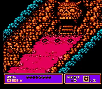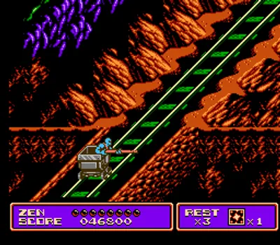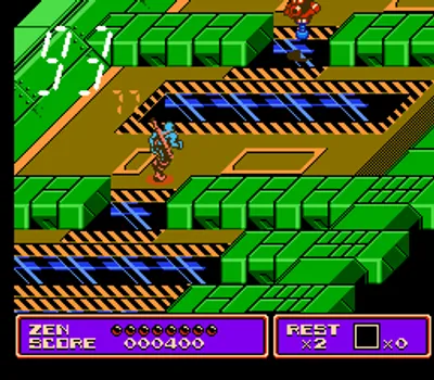 《Zen:银河忍者》改编自同名漫画,讲述了一位名叫Zen的激进环保忍者的故事。他受一群绿皮肤、尖头外星人的指派来到地球,不惜一切代价阻止环境污染。最终,他必须找到污染大王——污染者领主。游戏采用横版卷轴和等距3D卷轴动作玩法。Zen可以奔跑、跳跃、挥舞光子棒进行攻击,并根据游戏需要使用各种强化道具。