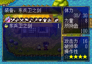 玩家可以从杂货铺、行商和传教士以及洞穴里收集到各式各样的物品,每种物品都有着攻击力、破损性,操作性三项属性,就不多剧透啦,那么各位,接下来就赶紧来体验汉化作品的魅力吧。